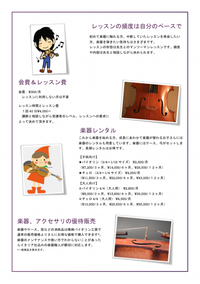 - 例えばバイオリンの場合、初めて楽器を始められる場合で月2回の40分レッスン(¥8,000)、楽器レンタル(分数バイオリン3ヶ月契約の場合、一ヶ月あたり¥2,400)、月額会費(¥300)で一月あたり¥10,700で始められます。