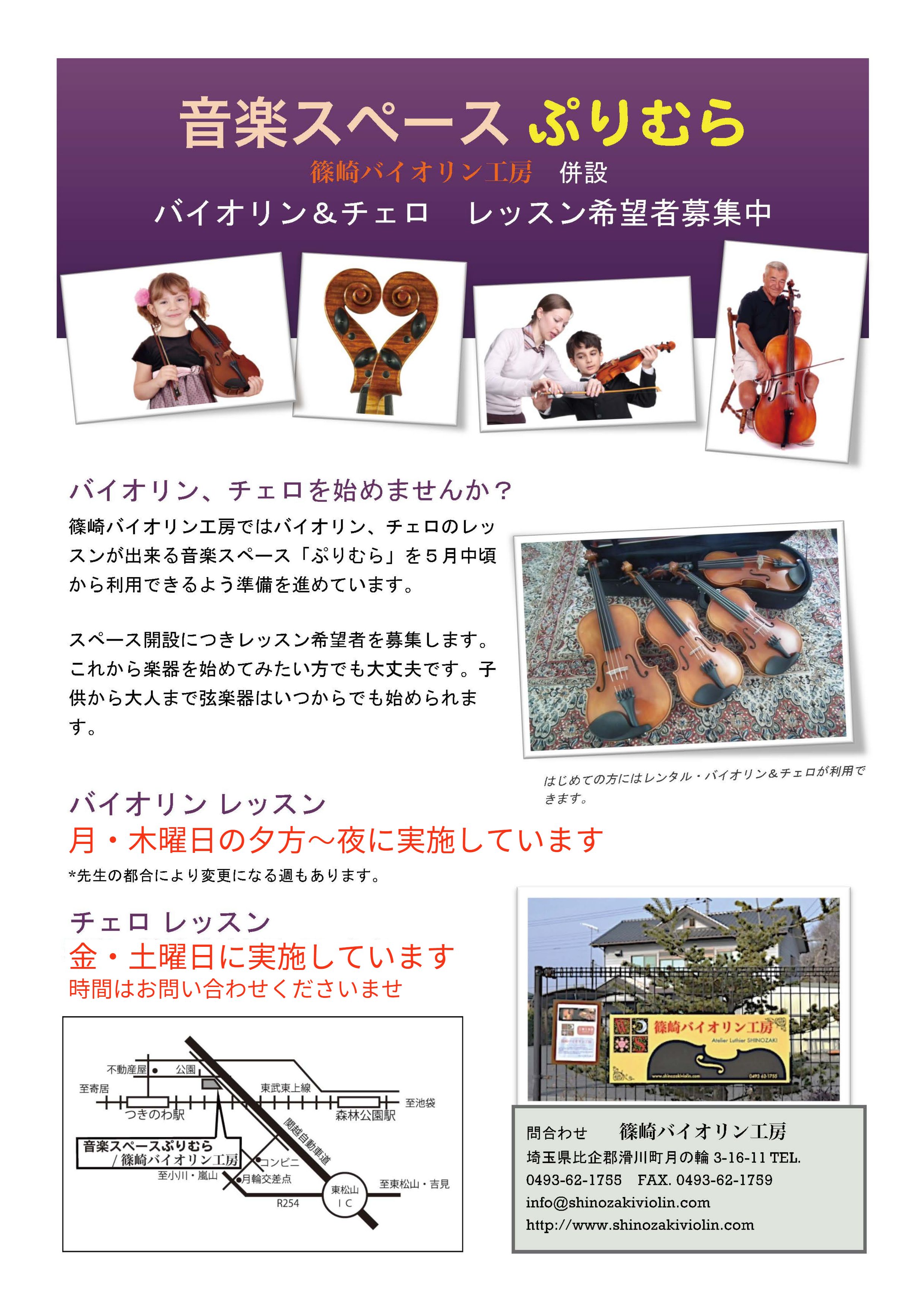 - 篠崎バイオリン工房では初心者向けのヴァイオリンセット(楽器本体+弓+ケース)で¥50,400(税込)から用意しています。チェロは同様に¥210,000(税込)から用意しています。